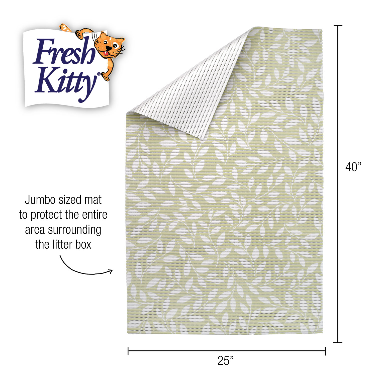 Fresh Kitty® litter mats combine style and functionality in one elegant solution. With an aesthetically pleasing design and ribbed texture, this mat effectively traps litter and prevents tracking, keeping your home clean and tidy. The waterproof backing protects your floors from moisture and mess, ensuring durability and easy maintenance. Perfectly sized to fit under any litter pan, this mat enhances your décor while providing a practical solution for pet owners.