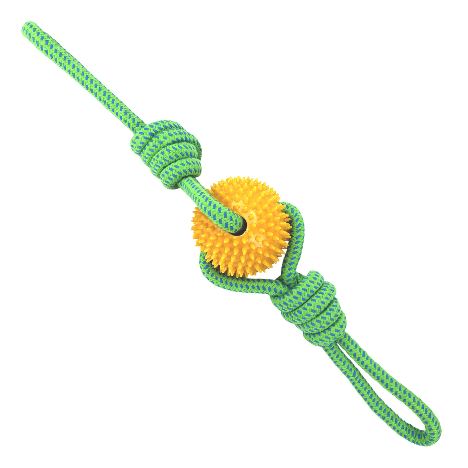 Get ready for some tail-wagging fun with the Gnawsome™ Ball & Rope Tug Dog Toy! This dynamic toy combines a tough, textured BPA-free TPR spiky ball with a durable rope, making it perfect for playtime with your pup. The spiky ball not only helps massage gums and clean teeth but also adds an extra element of excitement to playtime and the sturdy rope helps to floss teeth during games of tug of war.